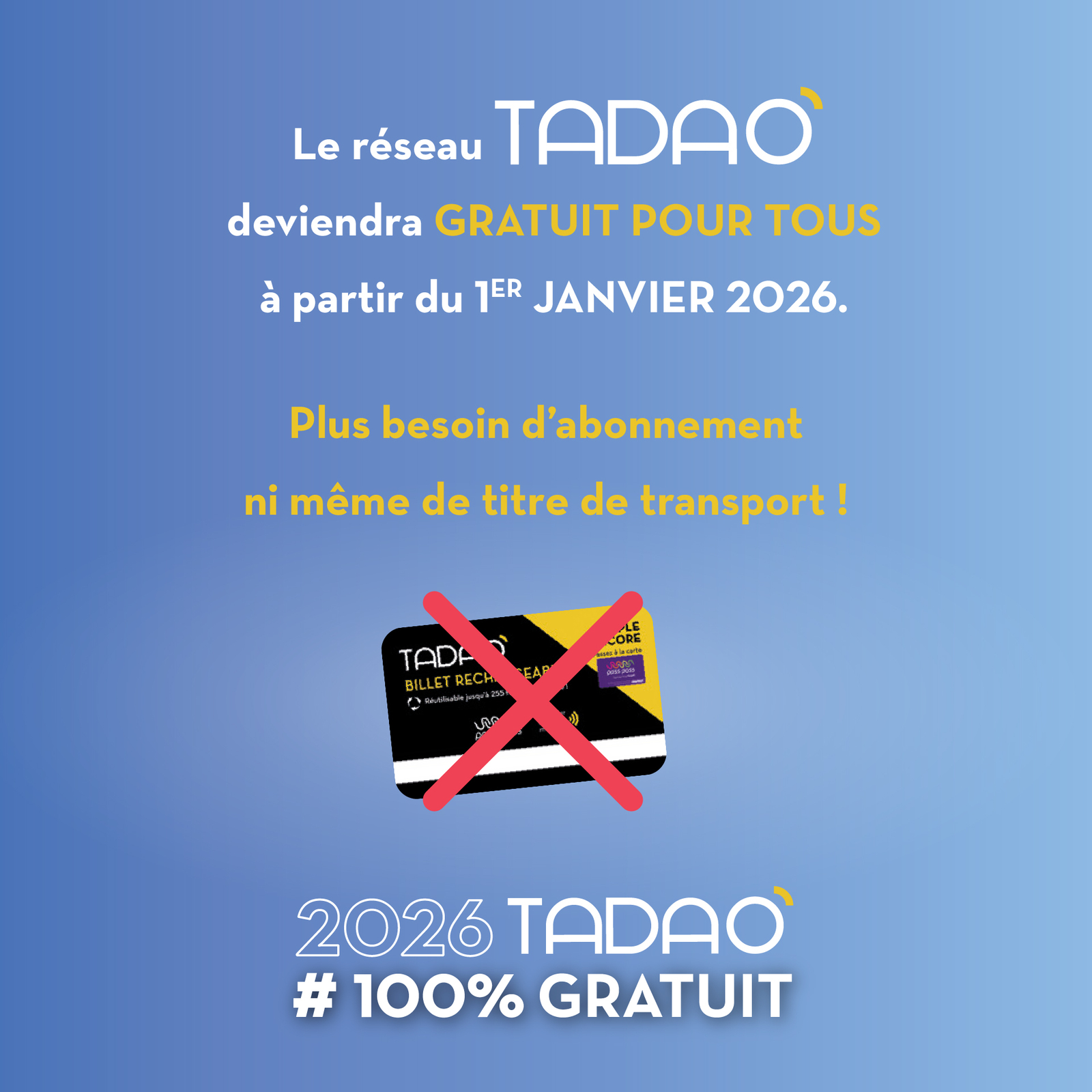 Dès le 1er janvier 2026, tout le monde pourra monter dans un bus TADAO sans aucun titre de transport, ni abonnement.