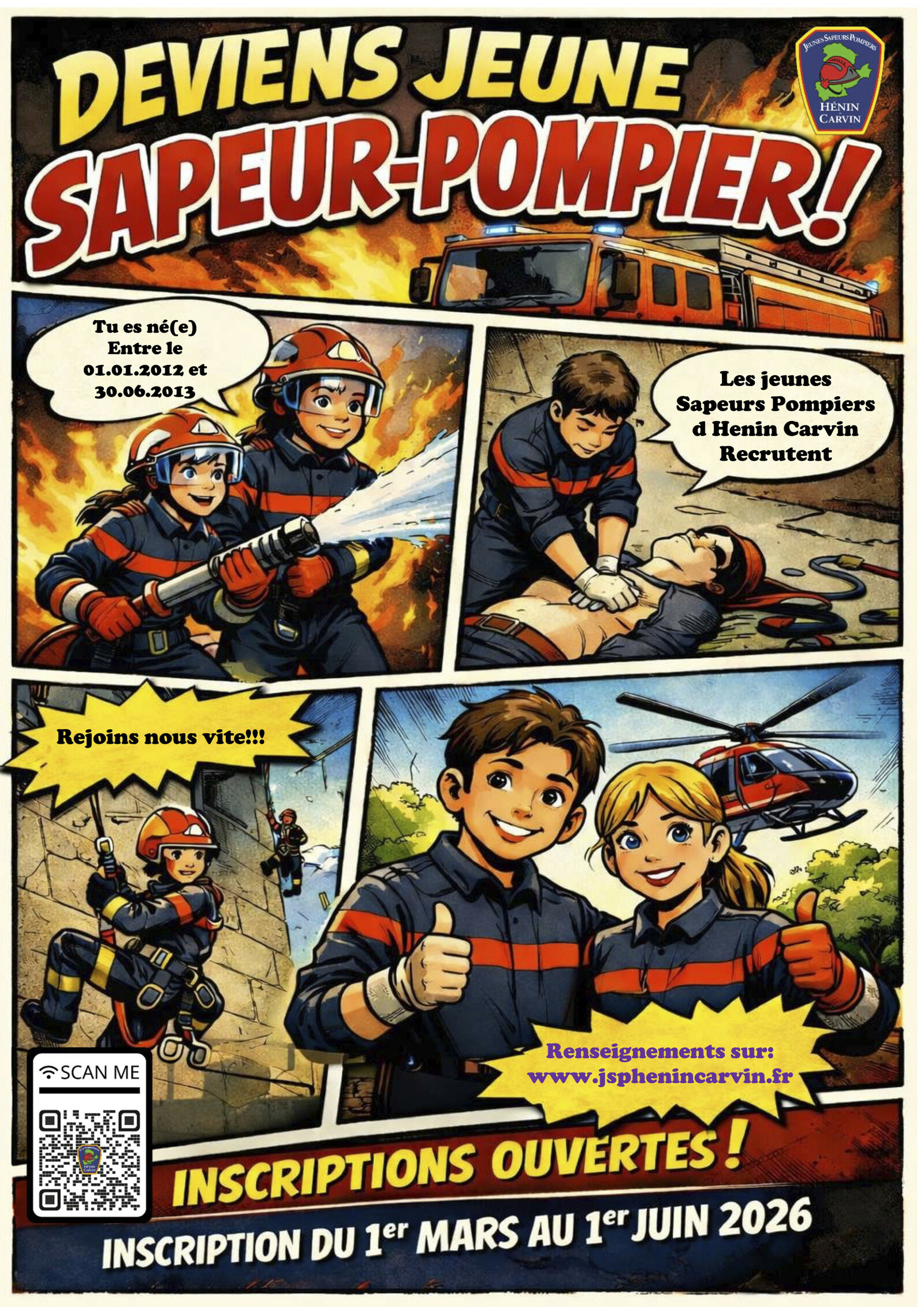 Scanne le QR code de l’affiche ou rends-toi sur https://jsp-henin-carvin.fr pour t’inscrire.